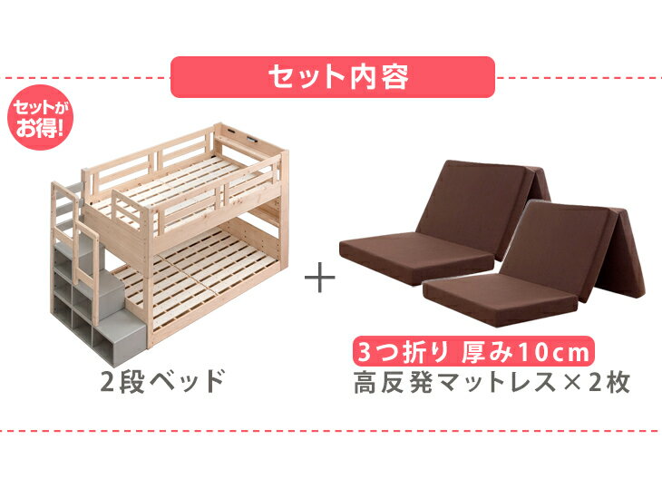 [お得セット] 二段ベッド + 高反発 マットレス付き 2枚 現役ママが考えた 九州産 ひのき 二段ベッド 階段付き ロータイプ 136cm 木製 2段ベッド 低め 子供 分離 大人用 マットレス 三つ折り マットレス付 【超大型】【後払/時間指定NG】