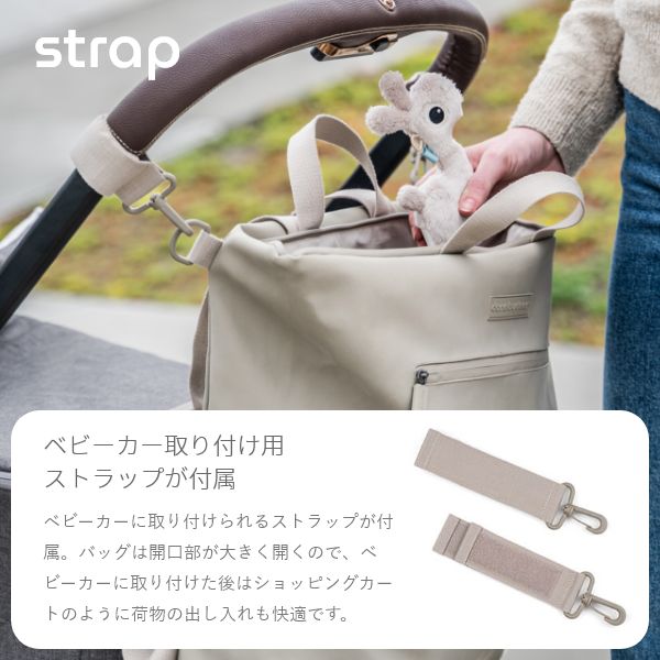付属のストラップを使うことで、バッグをベビーカーに取り付けることができます。