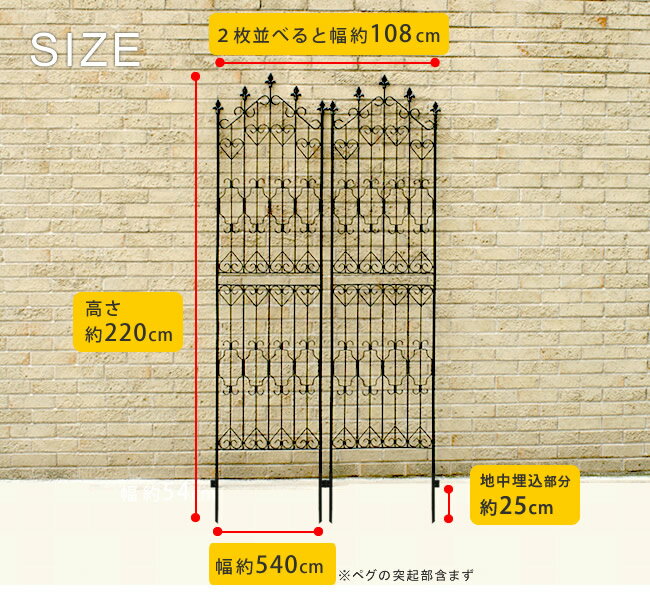 ■商品名 アイアンフェンス220(ハイタイプ)4枚組…DNF-220-4P ■カラー ブラック ■サイズ 本体:幅 約540×奥行 約14×高さ 約2200mm ※2枚並べた時の幅:約1080mm(ペグの突起部含まず) ※地中埋め込み部分:約250mm ■重量 約4.8kg(1枚) ■材質 スチール(粉体塗装) ■付属品 ・結束バンド 4本 ・埋め込み金具 8本 ■組立区分 簡易組立 ■生産国 中国 ■備考 ・結束バンドで左右を繋げることができます。