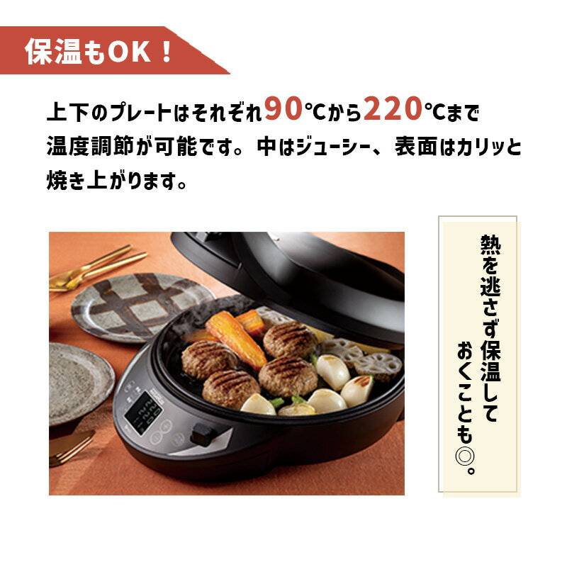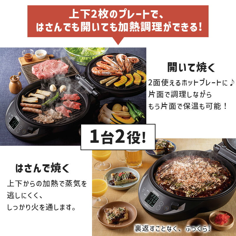 ●プレートを開けば、2面使える便利なホットプレートに!●片面で調理しながらもう片面で保温もOK!●上下のプレートはメニューに合わせてそれぞれ平面と波型につけ替え可能です。