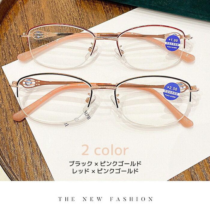 ■素材 フレーム:メタル合金 レンズ:硬質プラスチック樹脂PCレンズ (ブルーライト33%カットクリアレンズ) ■カラー ブラック×ピンクゴールド レッド×ピンクゴールド ■度数 +1.0 +1.5 +2.0 +2.5 +3.0 ■重量:約33g メガネクロス付属 (メガネの購入数量分) 【商品名】 老眼鏡 ブルーライトカット おしゃれ レディース フレームレス エレガント シニアグラス リーディンググラス 度数 1.0 1.5 2.0 2.5 3.0 PCメガネ パソコン 老眼鏡 おしゃれ レディース アイウェア プレゼント 贈り物 送料無料