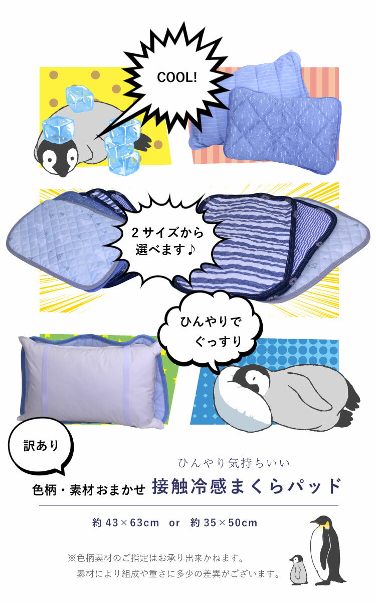 【訳あり】【色柄素材おまかせ】ペンギンひんやり接触冷感 まくらパッド 約43×63cm、約35×50cm 2タイプ