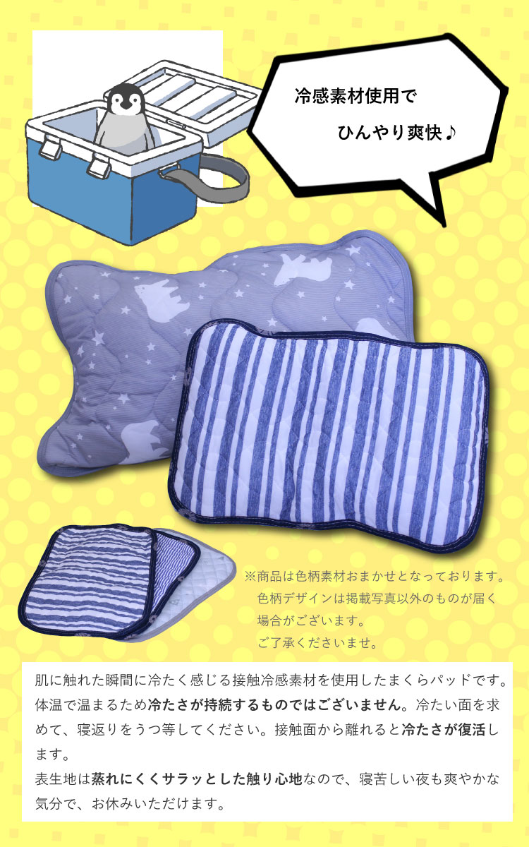 【訳あり】【色柄素材おまかせ】ペンギンひんやり接触冷感 まくらパッド 約43×63cm、約35×50cm ゴムバンドで着脱楽々 ≪暑さで寝苦しい夜もベタつかずひんやり接触冷感で気持ちよくお休みいただけます。