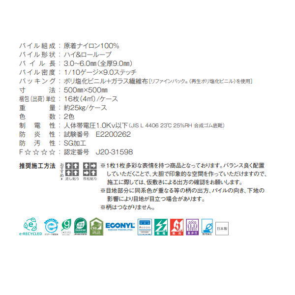 規格 パイル組成:原着ナイロン100% パイル形状:ハイ&ローループ パイル長:3.0〜6.0mm(全厚9.0mm) パイル密度:1/10ゲージ×9.0ステッチ パッキング:ポリ塩化ビニル+ガラス繊維布[リファインバック?(再生ポリ塩化ビニル)を使用] 重量:約25kg/ケース 制電性能:人体帯電圧1.0Kv以下(JIS L 4406 23℃ 25%RH 合成ゴム底靴) 防炎性:試験番号 E2200262 防汚性:SG加工 F☆