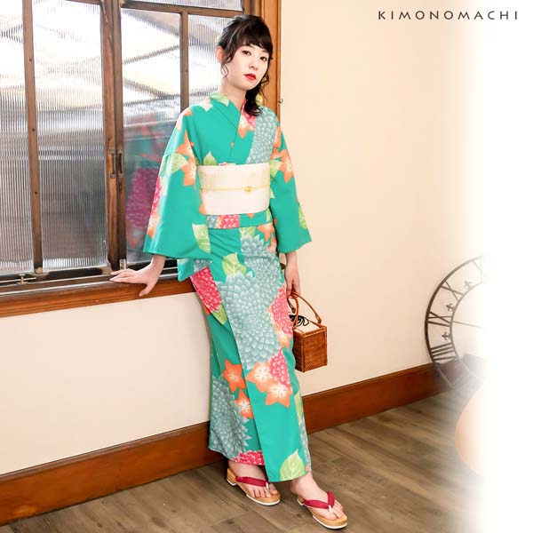 【商品内容】浴衣、帯の計2点【色柄】 浴衣:コバルトグリーンの地に赤みのピンクや淡い灰緑のダリア。