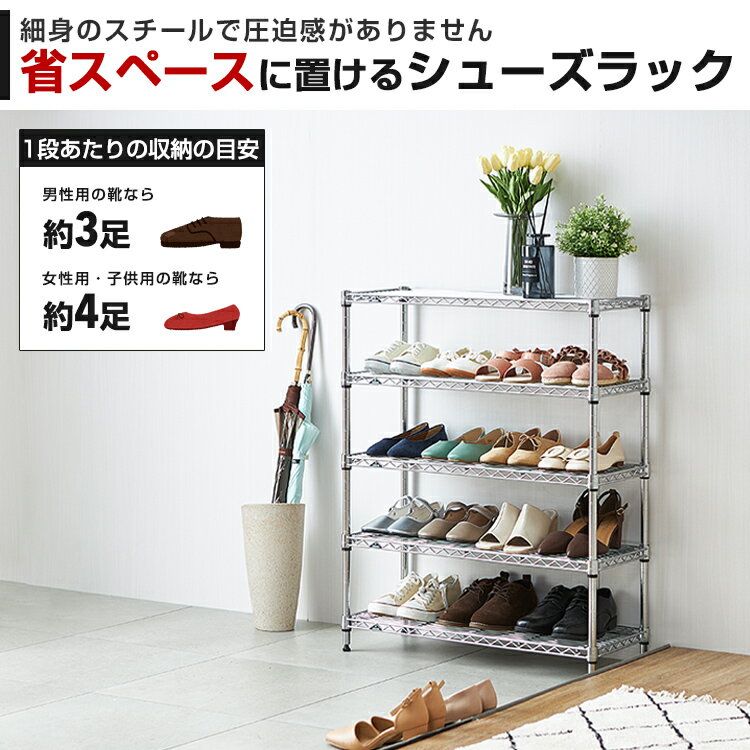 スリムで省スペース、シンプルな構造のシューズラックはワイヤーシェルフなので通気性も良く、匂いがこもりにくいため お気に入りの靴を飾って見せる収納としても。