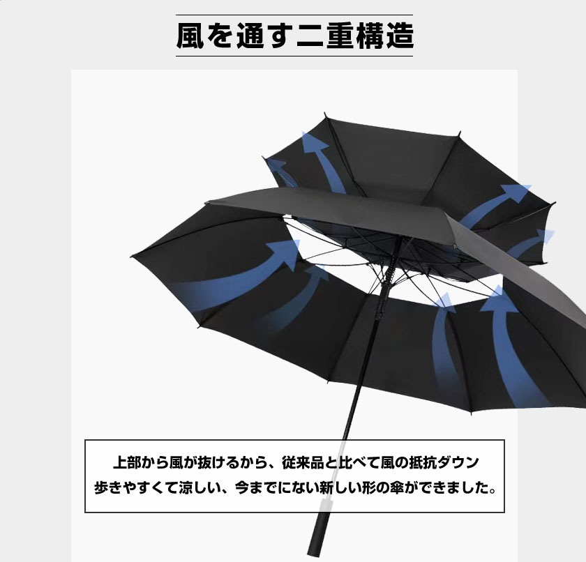商品特徴 ・【風を通す二重構造】上部から風が抜けるから、風の抵抗をダウン! ・【二重防風構造】二重防風構造、強風でも風の抵抗を感じにくい! ・【高強度の8本骨】頑丈で耐久性のある グラスファイバー製傘骨を8本使用しているので、壊れにくい! ・【直径は約135cmの大型サイズ】大きな荷物を背負っていてもOK!どの用途にも幅広く対応! ・【晴雨兼用日傘 】雨の日だけでなく、日差しの強い日にも使用OK! ・【EVA素材の持ち手】持ち手は柔軟性と弾力に富んだEVA樹脂を使用! 商品名称 ゴルフ傘 商品特徴 風を通す二重構造 高強度の8本骨 直径約135cmの大型サイズ 晴雨兼用可能 柔らかなEVA素材の持ち手 商品仕様 サイズ:約W135cm×H140cm 本体重量:700g 素材:グラスファイバー 備考 ※掲載の商品画像について:お使いのパソコンモニターなどの環境によって、実際の商品と色味が異なって見える場合がございます。