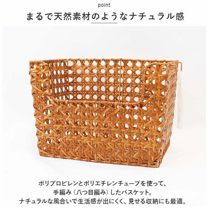【まるで天然素材のようなナチュラル感】・ポリプロピレンとポリエチレンチューブを使って、手編み(八つ目編み)したバスケット。