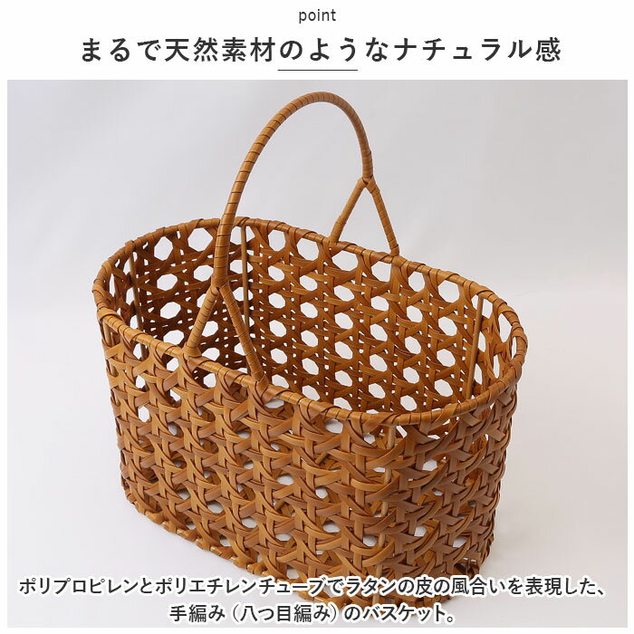 【まるで天然素材のようなナチュラル感】・ポリプロピレンとポリエチレンチューブでラタンの皮の風合いを表現した、手編み(八つ目編み)のバスケット。