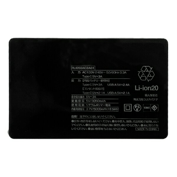 ラスタバナナ モバイルバッテリー Type-C1ポート/USB1ポート AC付リチウム充電器 5000mAh 3A(ブラック) RLI050AC3A01BK