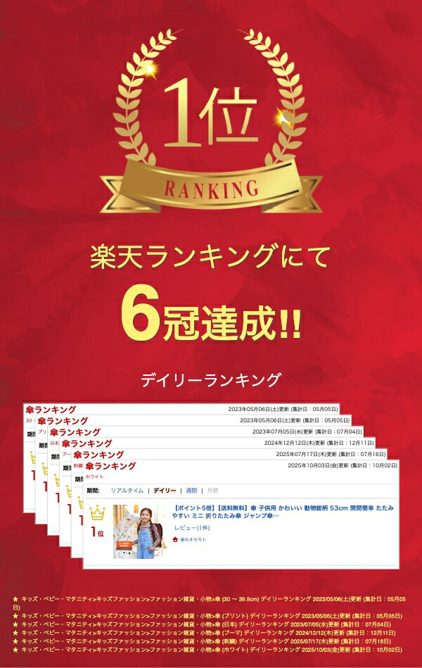 【折りたたみタイプの商品企画説明】 動物の種類 ゾウ、サイ、ライオン、虎 キリン、カンガルー、キツネ、鳥 ダチョウ、フラミンゴ、ヘビ アライグマ、亀、オオカミ 親骨の長さ 53cm 伸ばしたときの全長 59cm 閉じたときの全長 34cm 開閉 手開き式 本体のボタン スナップボタン 共袋のボタン マジックテープ 生地の色 オフ白 生地の素材 ポリエステル100% 1本の重量 約310g 生産地 中国 開いたときの直径 約94cm 【長傘ジャンプタイプの商品企画説明】 動物の種類 ゾウ、サイ、ライオン、虎 キリン、カンガルー、キツネ、鳥 ダチョウ、フラミンゴ、ヘビ アライグマ、亀、オオカミ 適応身長 115-130cm モデルさんの身長 83cm 親骨の長さ 53cm 全長 73cm 開閉 ジャンプ式 本体のボタン スナップボタン 生地の色 オフ白 生地の素材 ポリエステル100% 1本の重量 約360g 生産地 中国 開いたときの直径 約93cm 【商品画像について】なるべく実物に近い状態になるように努力しておりますが、 光の具合やパソコンのモニターの種別、環境によっては見え方が実際のものと異なって見える場合もございますのでご了承ください。