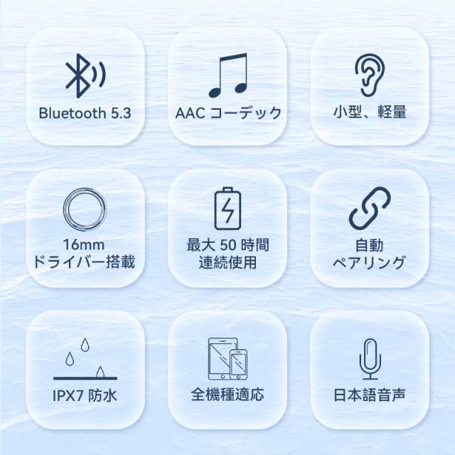 音楽を楽しみながら、運動や通勤、ウェブ会議、ゲーミングなど様々な場面で活躍できる! 製品仕様 連続動作時間:最大50時間 Bluetooth:5.3 充電時間:2H 充電ポート:type-c 防水規格:IPX7 ご注意 商品在庫につきまして 最大限の注意を払っておりますが、複数の店舗と在庫を共有しているため在庫表示と異なり当店に在庫が無い場合がございます。